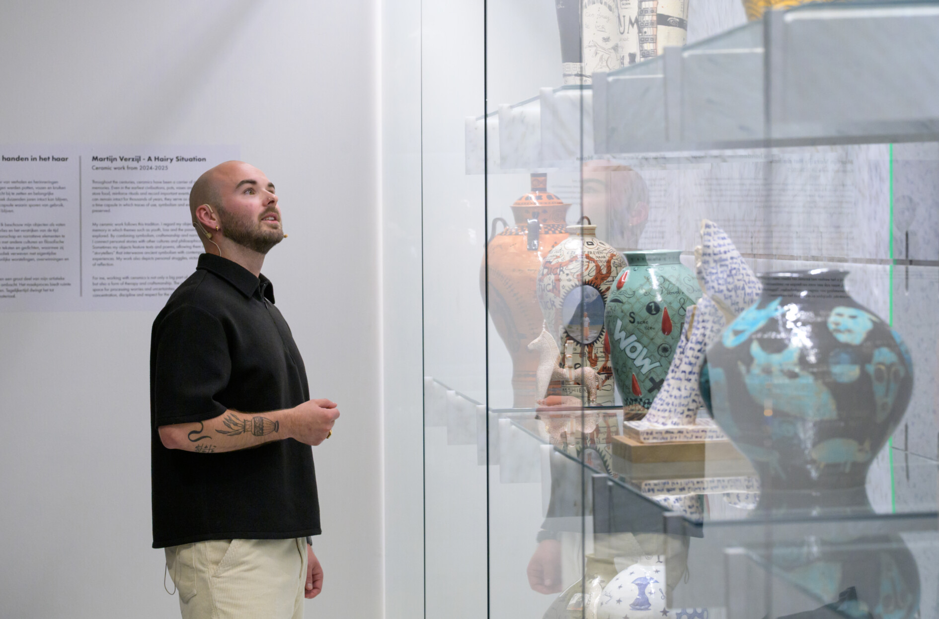 Design Museum Den Bosch presenteert met trots het keramische werk van de jonge Bossche kunstenaar Martijn Verzijl (1999). Het is de eerste museale solopresentatie van Verzijl, die naast zijn artistieke praktijk ook suppoost is in het museum. In de keramiekkast bovenaan de monumentale gedraaide trap van het museum, ontdek je een kleine maar fijne selectie uit het werk dat Verzijl maakte in 2024 en 2025. Deze presentatie hangt samen met de keramiektentoonstelling The Surface Decoration Ball, die elders in het museum te zien is.